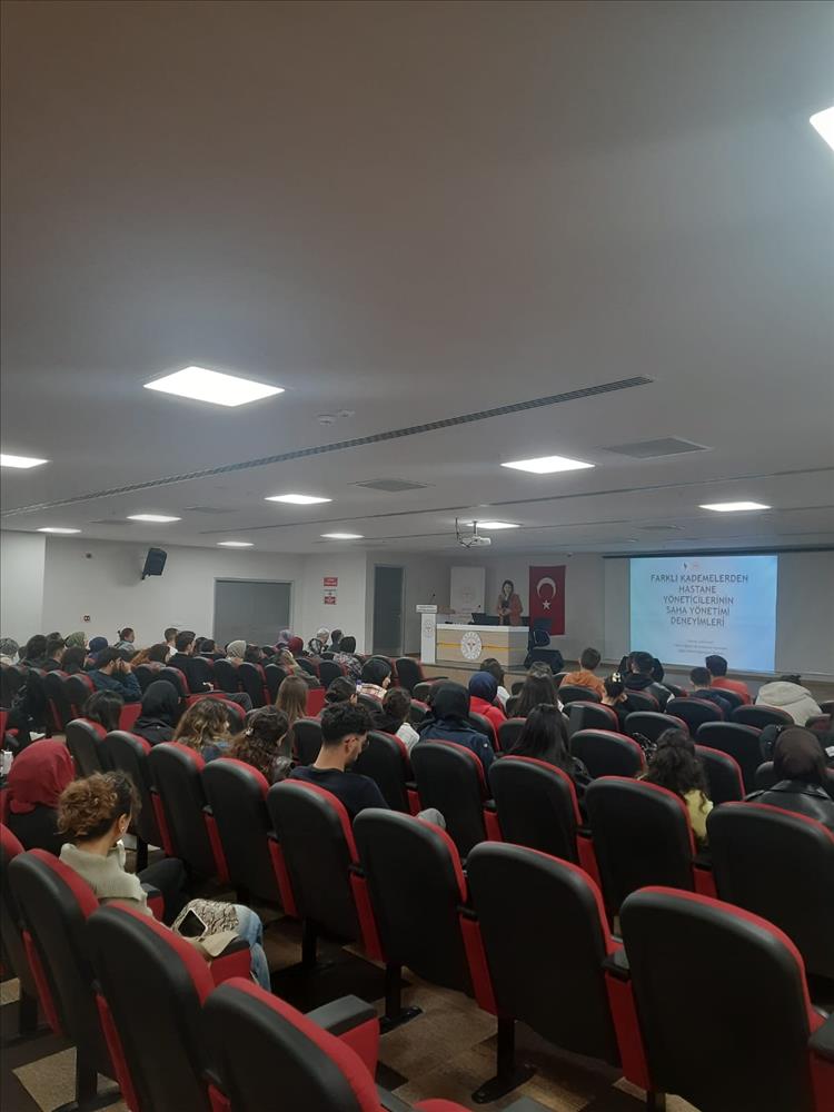 Bölümümüz ve Yalova Eğitim ve Araştırma Hastanesi işbirliğiyle hastane konferans salonunda “Farklı Kademelerden Hastane Yöneticilerinin Saha Yönetimi Deneyimleri” etkinliği sağlık bakım hizmetleri müdürlüğü, servis sorumlu hemşireleri ve eğitim hemşirelerinin katılımıyla gerçekleştirildi. Etkinlikte Sağlık Bakım Hizmetleri Müdürü Zeynep ÇAĞLAYAN ve Koordinatör Servis Sorumlu Hemşiresi Özden AYDIN sahada bakım hizmetlerinin yönetimi hakkındaki deneyimlerini öğrencilere aktardılar. Etkinlik sonunda öğrenciler “Hemşire Çalışma Çizelgesi” oluşturma uygulaması yaptılar.